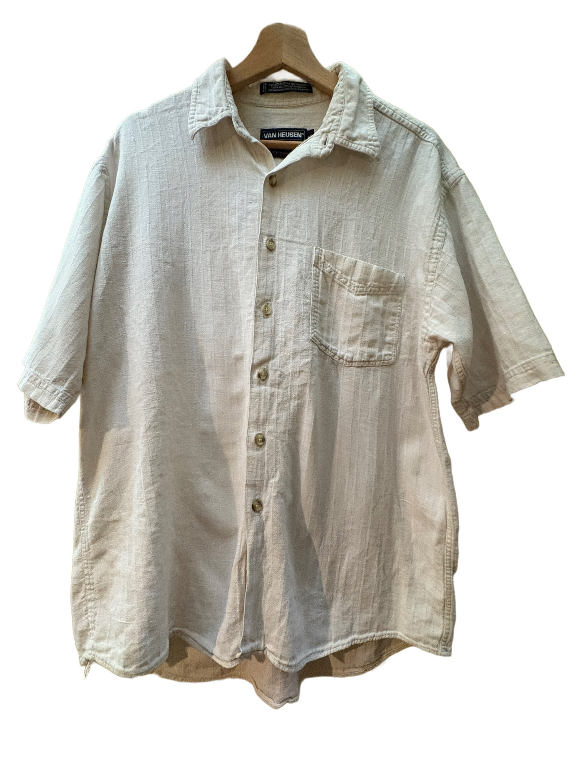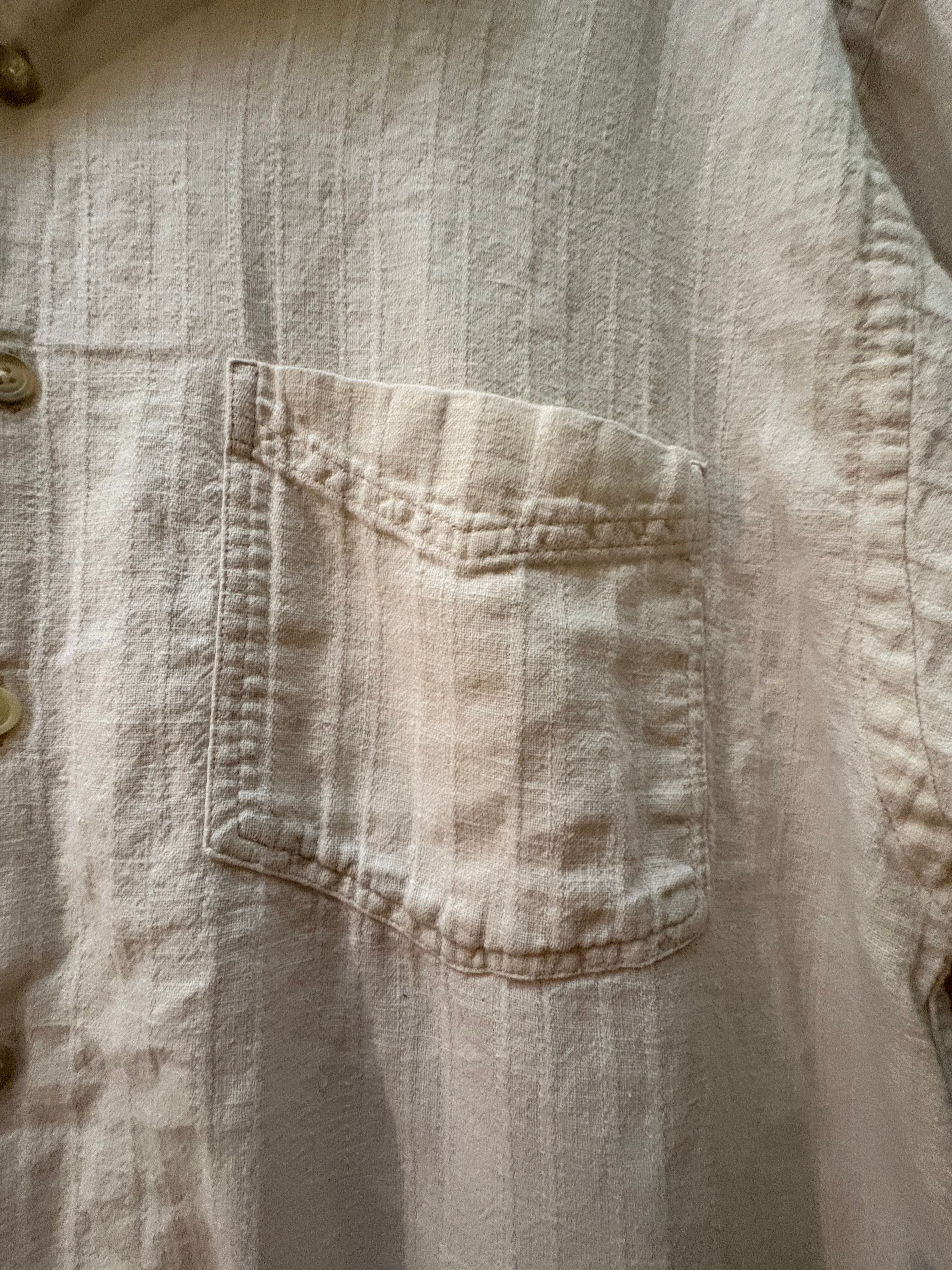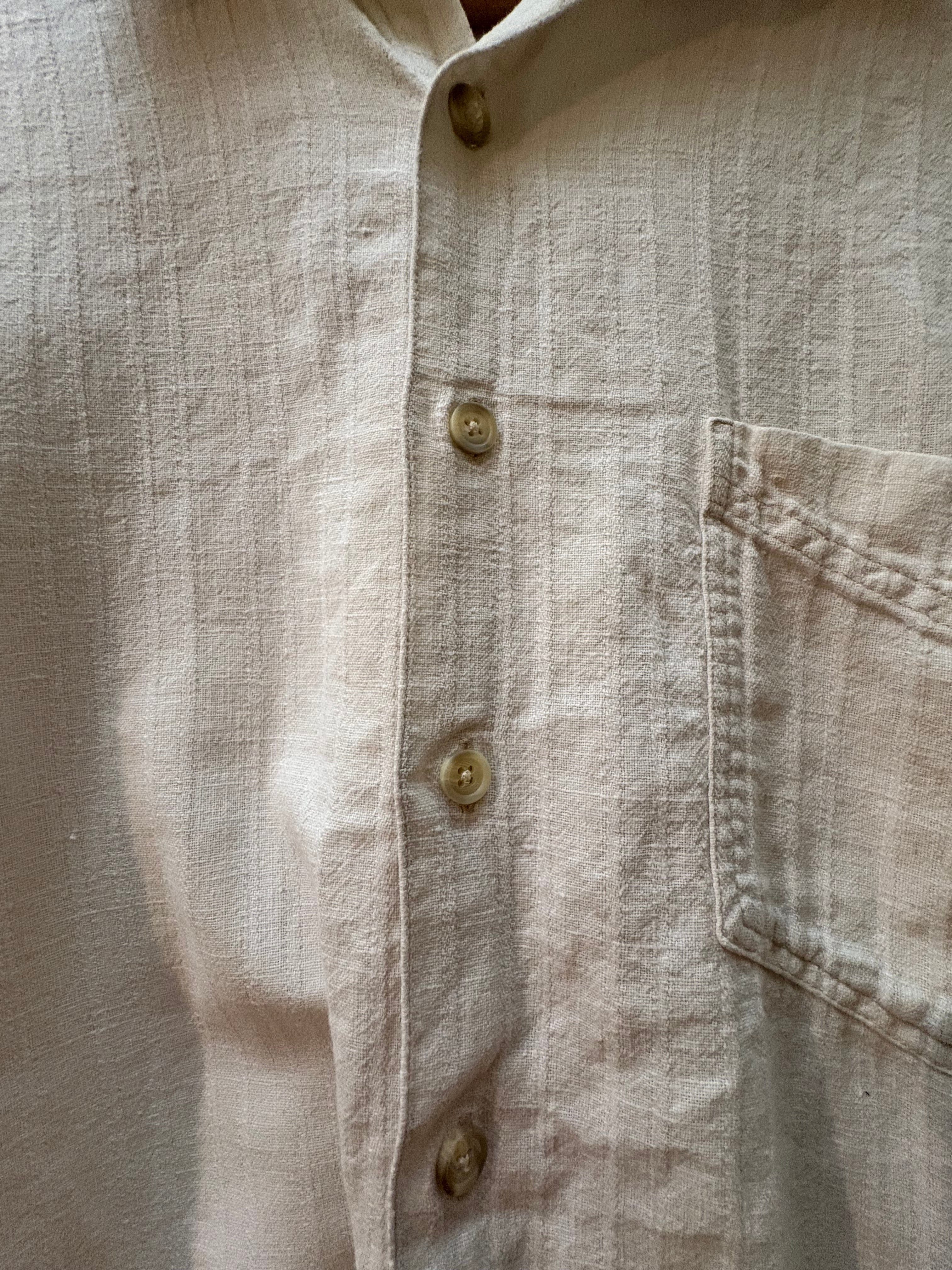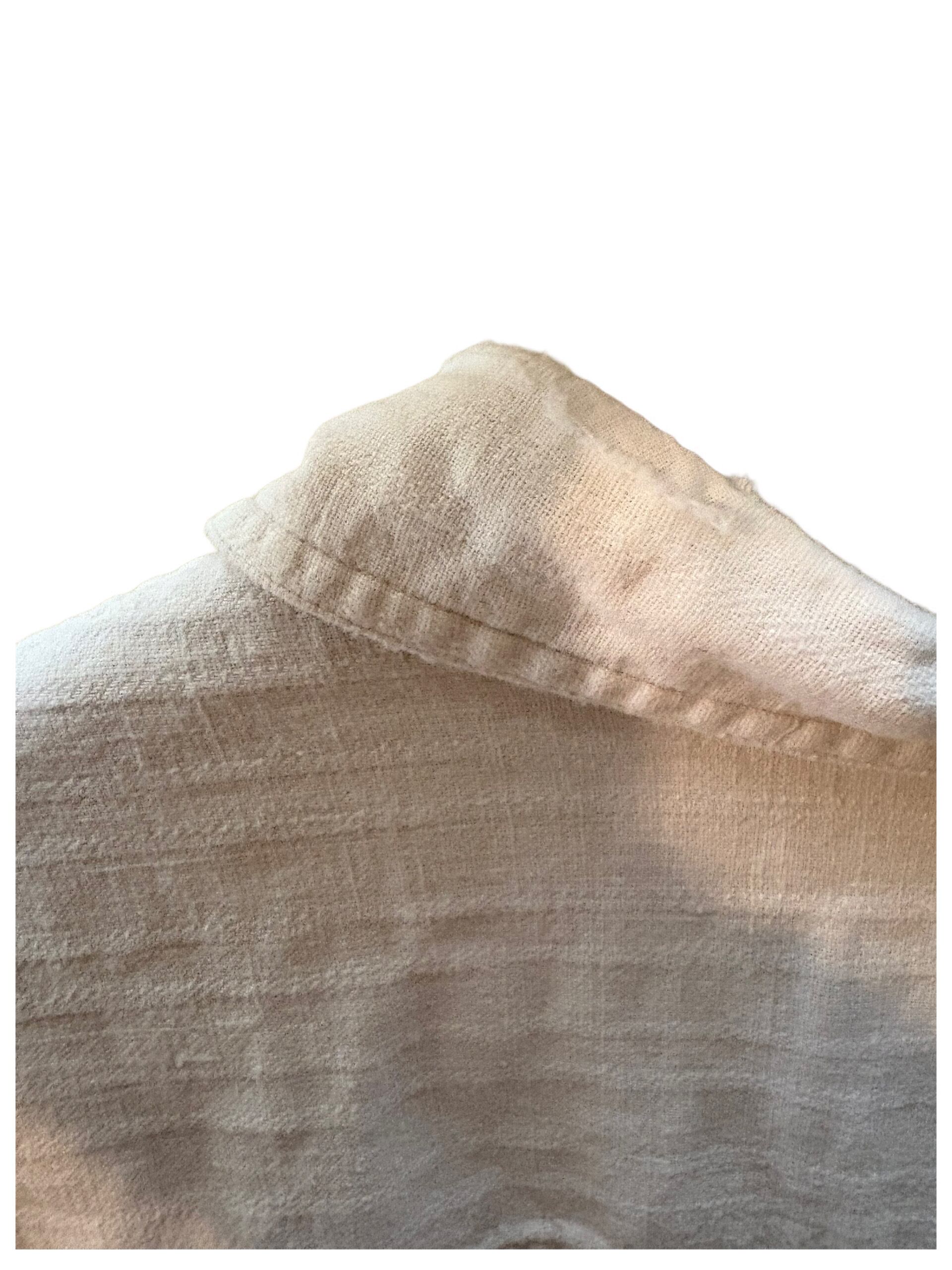 本品は1990年代製、リネン55%・コットン45%のホワイトシャツ。リネン特有の通気性と清涼感に、コットンの柔らかさを加えた生地感が魅力です。