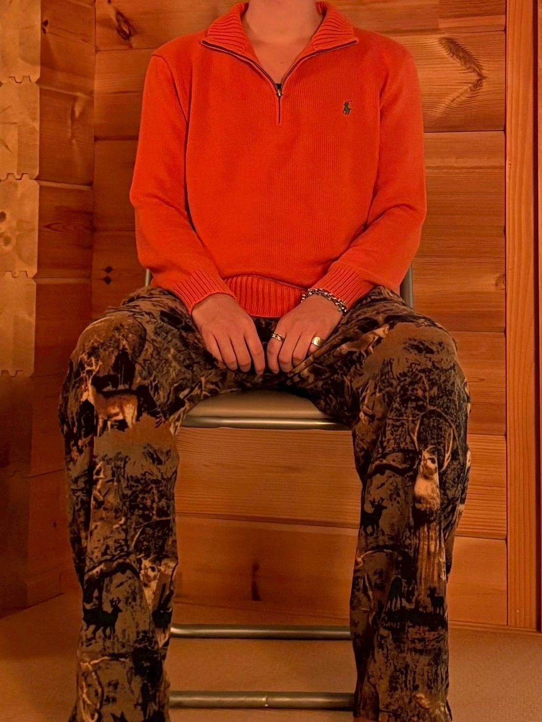 ビビットなオレンジにグリーンのワンポイント。配色がかなり良いかと。スラックスなんかと合わせて綺麗めに落とし込みたい1着。ぜひ!